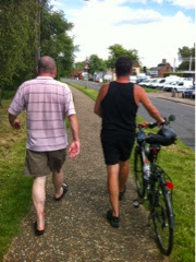 Cousin Murdo Durrant and Liz were more than generous with their hospitality. We had a peaceful night at their house in Bircham Newton. Following a hearty breakfast we returned to the scene of the crime where we had left our bikes at the pub in Tydd St. Mary. A relatively short ride to Fakenham and a very special concert being promoted by Billy and Murdo Durrant at the Community Hall. No aches and pains and no apparent problems with the bikes, we were on the road by 10.45 The main trunk road, that is the A 17, is a fierce major access route to my home county and we wished to avoid this as far as we could. Mr. Durrant was used to my quiet and peaceful cross country routes which allowed him time to contemplate the meaning of life, make telephone calls and listen to music without disturbance. On the major roads there was no time for that. Full attention to the road, the conditions and the careless drivers is required. Very quickly, I led the way to Sutton Bridge and we darted down the A17 for three miles before leaving it for Terrington St. Clement and Clenchwarton. There had been a little clenching going on as his nibs had been suffering a little again with his backside. Nothing that a little ointment would not deal with. He seems to have managed to just about keep on top of his bottom,so to speak. You will be pleased that I, up till now, have not had any problems in that department. My major problem has been arthritus in my fingers. On some occasions this has been quite painful. I have suffered in silence as you might expect. Once on the quiet lanes we sped along through Kings Lynn and then out towards Gayton. One or two hills here and there but nothing to delay or trouble riders of our experience and calibre! The hills in North Norfolk were formed at the end of the last ice age when the great ice sheet was melting at this point and huge amounts of debris caught up in the ice were deposited as a terminal moraine. Free geography lesson there. We cut up through the Massinghams and along to the Rudhams where we happened upon a lovely looking tea shop. We had earnt a break by this stage. We sat and waited and had to ask to be served. I placed my order, strangely, a cream tea again. More problems. Sorry no scones. Now I ask you. A tea shop with no scones. That is the same as a pub with no beer. I was offered a freshly baked Bakewell tart. Are they similar? The artiste opted for a more savoury choice; the toasted cheese and onion sandwich. Not a huge order and relatively simple but one that after twenty minutes of waiting we had to chase. Would they have kept Bradley Wiggins waiting like this? Does Cavendish hang around? Our average speed for the day was dropping all the time. Back on the bikes we managed to get a little confused on the back doubles going into Fakenham. We eventually arrived at the Bell Inn at Hempton where we met up again with Cousin Billy at 15.00 and 40 miles completed. I managed to keep the artiste out of the pub, he was focused on the set up for the show. We walked the bikes into town with Billy and interviewed him for the video blogs on the old platform of the railway station at Fakenham West. We had so much help to get the community hall ready and within no time the venue was set for the evening and the bikes were in position. A short time to relax and chat. To my utter surprise Billy then presented me with £122.00 for the Big C Charity. This was raised by Billy and the regulars at the Bell Inn. What an effort and a great boost to the chraritable aspect of this long nationwide tour. Thank you to everybodyat The Bell. Tickets sales were encouraging and by show time the hall had seventy in the audience keen to hear the new work of the maestro. He was in fine form and with familiar faces and family in the crowd they were all on side. Great times were had. Melvyn and Leslie along with his Mother Gwen, great friends of mine, came to support the show and also bring my vehicle and trailer. We had two days off the merry go round which is the Cycling Music Tour. Richard was off to Shoreham and I was going home to Eccles for the first time in nearly six weeks. I had not driven in that time. Strange feeling. Clear up complete and bikes loaded in my trailer I took to the road and headed home arriving at just after 23.30 Domestic chores a plenty. 1147 miles to date on the tour.